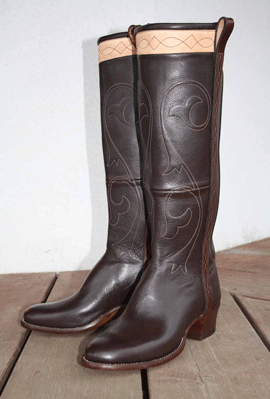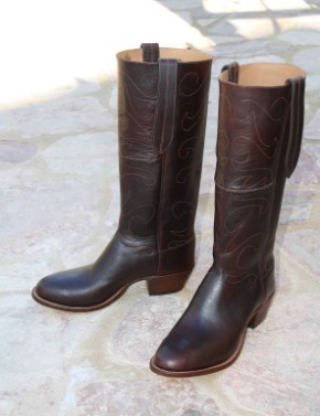 | BELLE STARR Handmade Buckaroo Old Style Boots for Bandidas and Buckarettes Classic 17" Stovepipe Top, 100% vegetable tanned antique brown Leather. Linen Pull Straps, long base riding heel. Old style like the rustic Cowboy Boots of the Cattletrails.